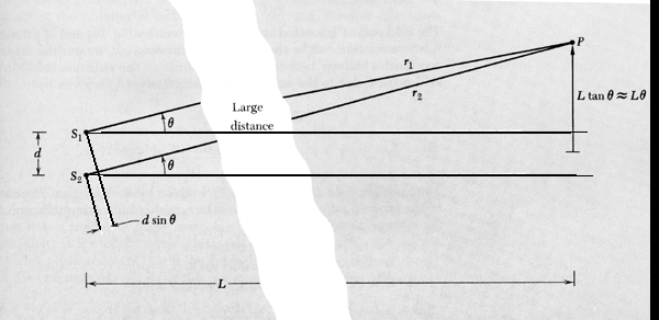 S1 and S2 are far way from P so the two angles indicated as above are equal (this is called the far-field approximation). Notice the following about this figure: