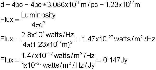 The Sun's luminosity at a particular frequency is 2.8x108 watts/Hz. If it were located at a distance of 4 pc, what would be its flux in Jy?