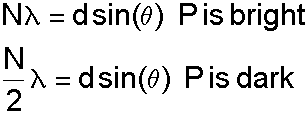 You can see that for a fixed distance d, the brightness at P will depend on the wavelength of the light. An extrapolation of this result explains how a diffraction grating works -- a grating is essentially a series of lines that act like light sources (the S1 and S2 above) so that the light that is transmitted to a distant screen (P above) will have brightnesses at different locations proportional to the brightnesses at different wavelengths in the incoming beam of light.